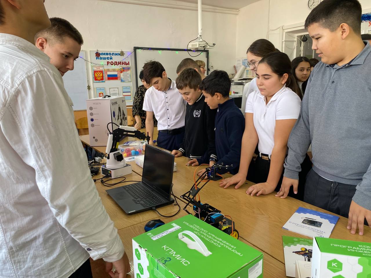 Неделя завершилась мероприятием, в котором приняли участие все обучающиеся школы. В кабинетах физики, химии, биологии, информатики были организованы выставки работы нового оборудования "Точка роста" с демонстрацией процессов и явлений. Обучающиеся старших классов рассказали младшим школьникам о работе с новым оборудованием. В кабинете физики показали работу датчиков цифровой лаборатории по определению силы тока, напряжения, давления, температуры, усилия. В кабинете химии демонстрировали электронный pH-метр, который исследует кислотность почв, а также USB-микроскоп, с помощью которого исследуются микрообъекты. USB-микроскоп имеет кабель, который подключается к компьютеру и один бинокуляр. Преимущество данного микроскопа в том, что можно выводить на экран монитора изображение и видеть объект невооружённым глазом. В кабинете информатики ученики демонстрировали работу роботов-манипуляторов, способных выполнять, согласно заданной программе, перенос предметов, лазерную гравировку, рисование, 3D-моделирование. На мероприятие были приглашены родители. Мероприятие вызвало большой интерес у всех участников.