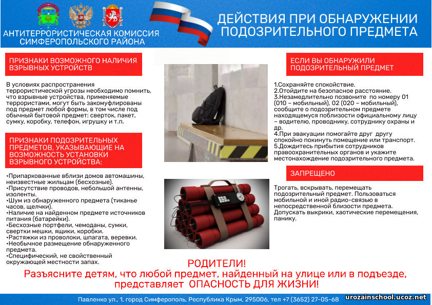 - категорически запрещается трогать, вскрывать, передвигать или предпринимать какие-либо иные действия с обнаруженным предметом;