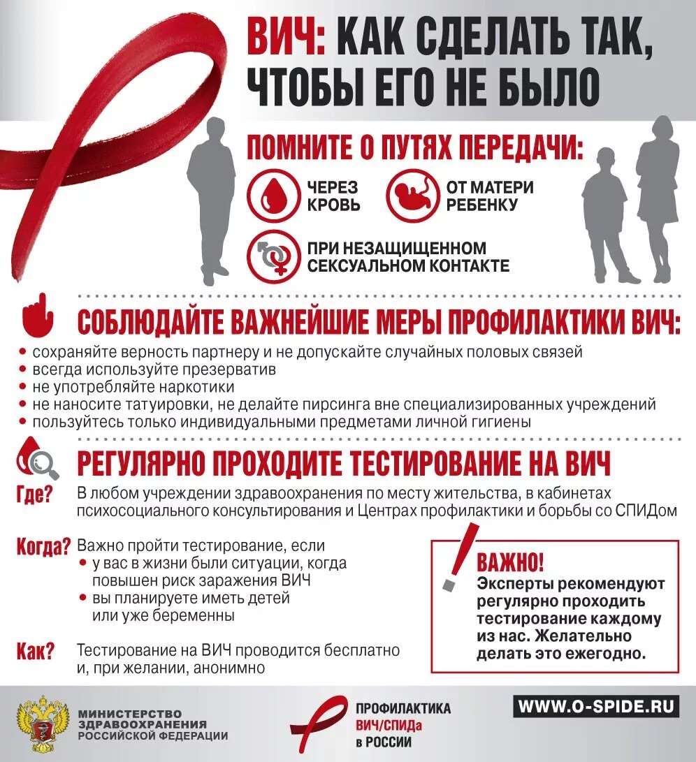 Пройти обследование на ВИЧ-инфекцию можно анонимно и бесплатно в любом лечебно-профилактическом учреждении, в центрах по профилактике и борьбе со СПИД.